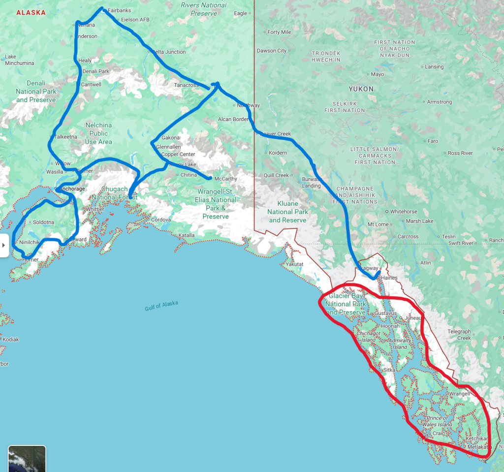 “Didn’t you just visit Alaska?” friends have asked. Well, yes, we took our RV there on an 8500-mile, 11-week trip in 2023. See the blue route below for the area of Alaska (and a bit of the Yukon Territory and British Columbia) that we visited in 2023.
