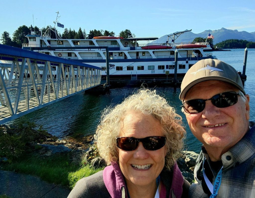 So, off we flew at the end of August to Sitka, Alaska, where we boarded our boat for a 9-day adventure. Many people do an Alaskan cruise on a very large ship, but we opted for a different experience on the Baranof Dream with the Alaskan Dream Cruises company. This ship/boat has only 25 cabins, and we were 2 of 32 guests on board. After our orientation and after-dinner discussion, the boat headed out to Glacier Bay, traveling all night. (All photos are from Hank or Cindy’s phone or camera, unless otherwise noted.)
