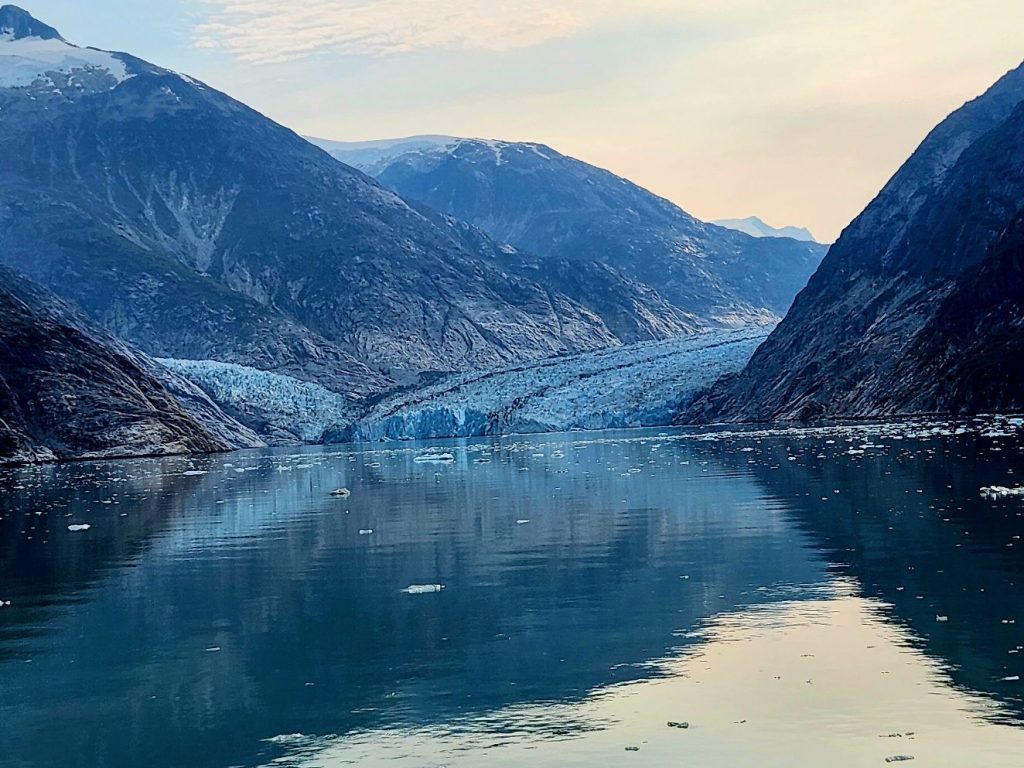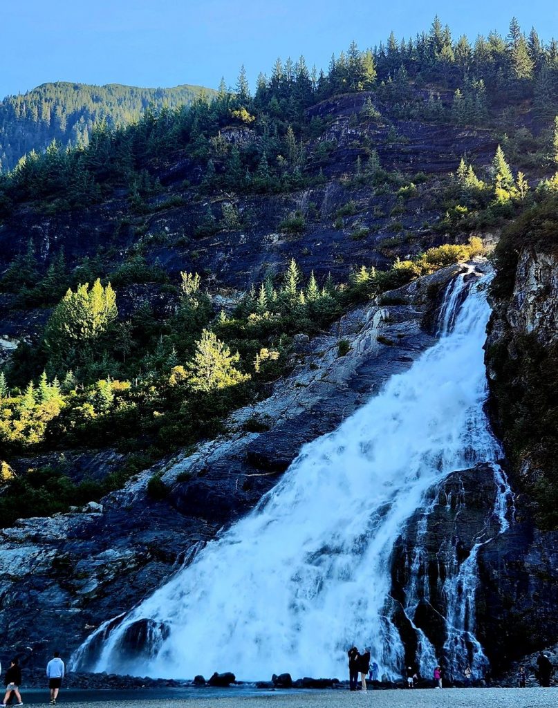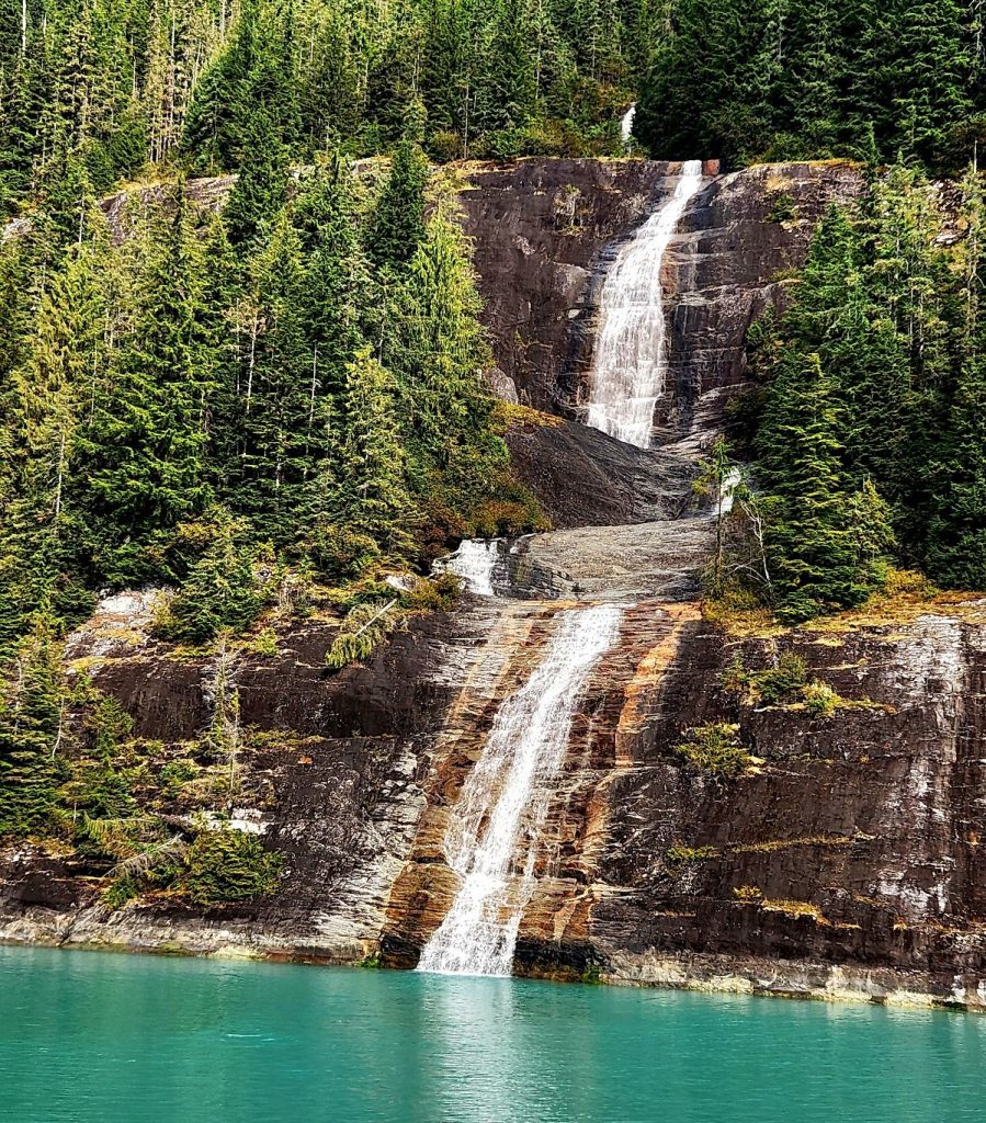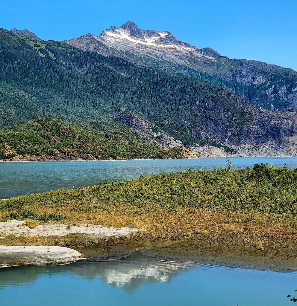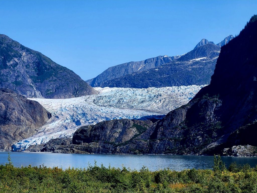 We traveled all night and woke up in Juneau, Alaska’s capital, and the only U.S. capital city that you cannot drive to from other parts of the state. Not on an island, but sort of on a peninsula surrounded by high mountains you can’t drive over, Juneau is a popular stop for big cruise ships, which made our little boat look like a toy. We had a bus ride up to the Mendenhall Glacier, where we enjoyed the Nugget Falls Hike, Photo Point, and Steep Creek (where we saw only dead salmon).