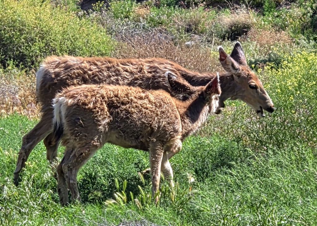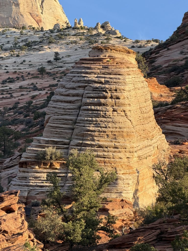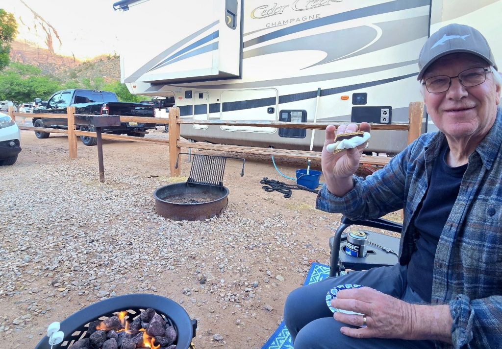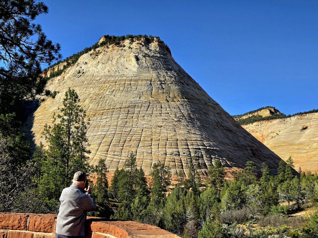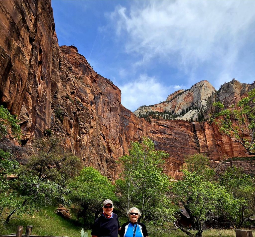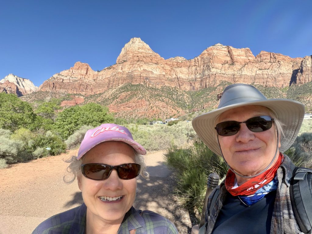 Our last Zion excursion was on our bikes, where we rode into Watchman Campground in hopes of finding the campsite where we stayed 35 years ago. Our memories aren’t that good, so we couldn’t pinpoint the site, but we discovered that A and B loops have electricity hookups, so that was good to learn for future reference. And we saw some mule deer that were relaxed and enjoying hanging out in the campground.