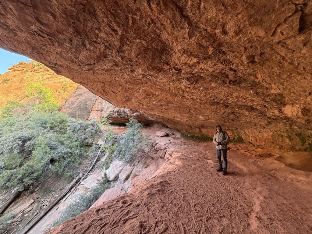 We opted to start our morning at Shuttle Stop 7 for the short (1/2-mile round trip) hike to Weeping Rock, an overhang that has constant dripping water and therefore some hanging gardens (which weren’t much at this time of year). Since it was 48 degrees when we left our campground, we needed this steep hike to get us warmed up.