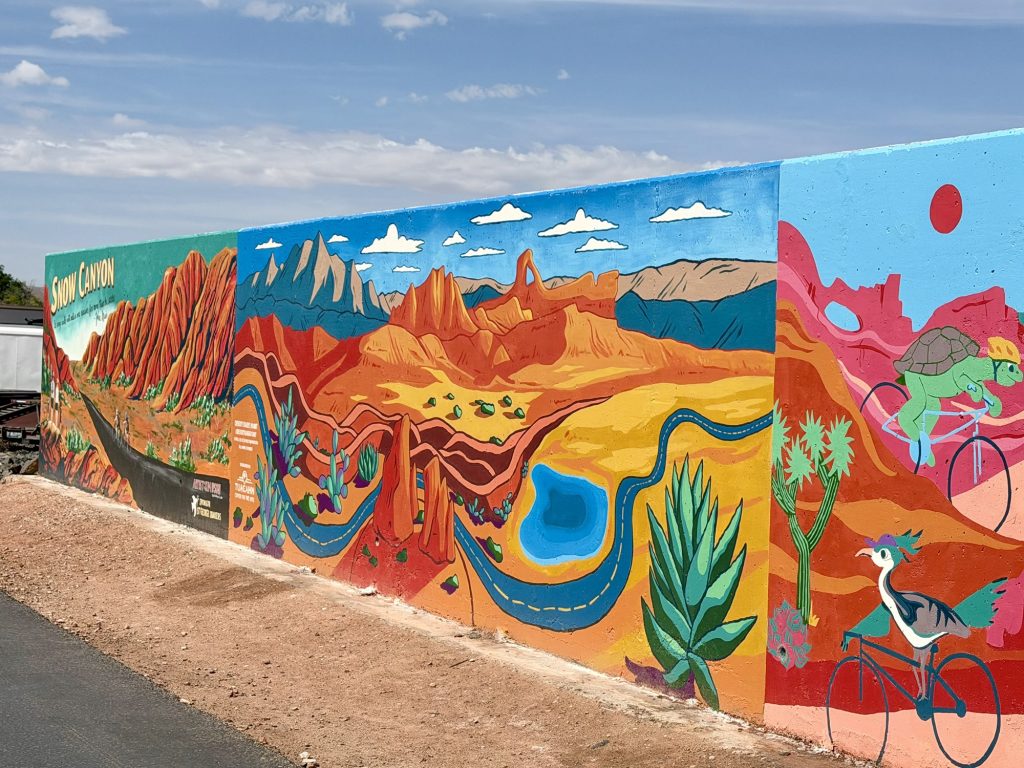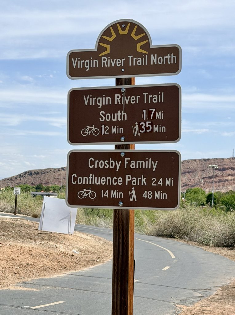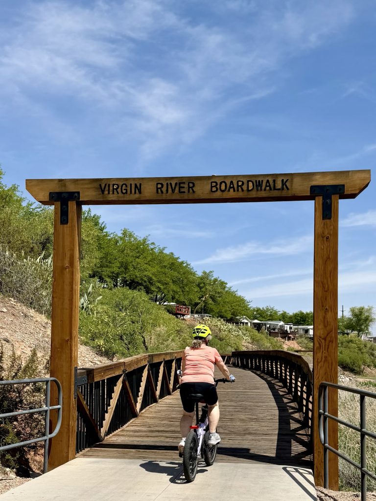 Next morning, we drove to Sunrise Valley Park in Washington, Utah, and began our 25-mile round-trip ebike ride along the Virgin River Trail. This paved trail was well-marked and well-maintained, so we had a great time enjoying the red rocks, marshlands, lizards, quail, and other sights. We tried to go up the very steep Hell Hole side trail, but alas, they were doing maintenance work, so we had to abandon that portion.