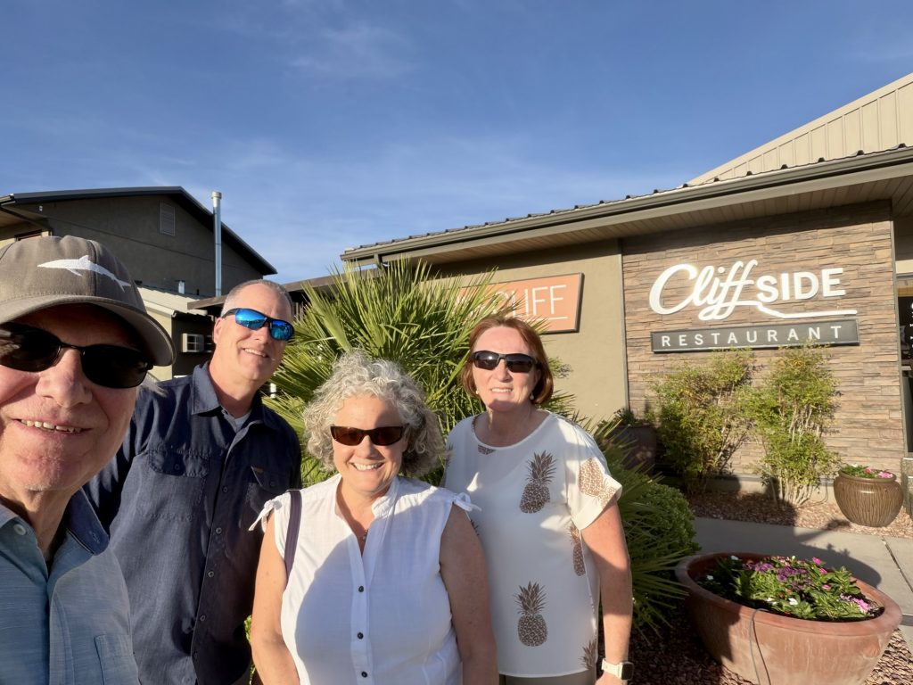 We capped off our time in St. George by having dinner with Fiji dive buddies Dee and Steve at Cliffside Restaurant, which had delicious food and a sublime view of the red rocks near St. George. This was a great way to close out our time of searching for red rock!