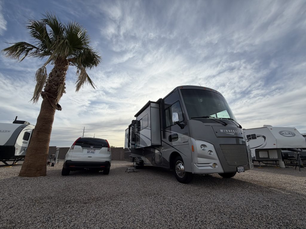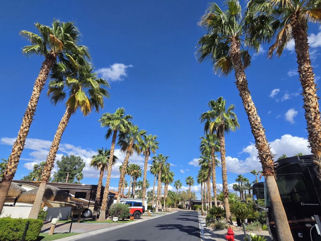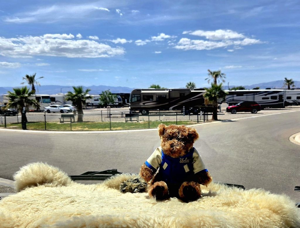 After watching the UCLA women’s basketball team (on TV) win the NCAA national championship and joining them at Pauley Pavilion for their victory celebration, we packed up the cats and ebikes and headed to our home campground in Valencia, California. The next day I taught my last UCLA class (after 29 years) and the following morning we drove the RV (complete with Baby Bruin Bear, a gift from my students in Cohort 32) across the Mojave Desert of Southern California to Las Vegas, Nevada.