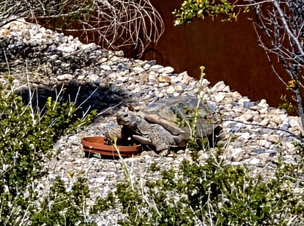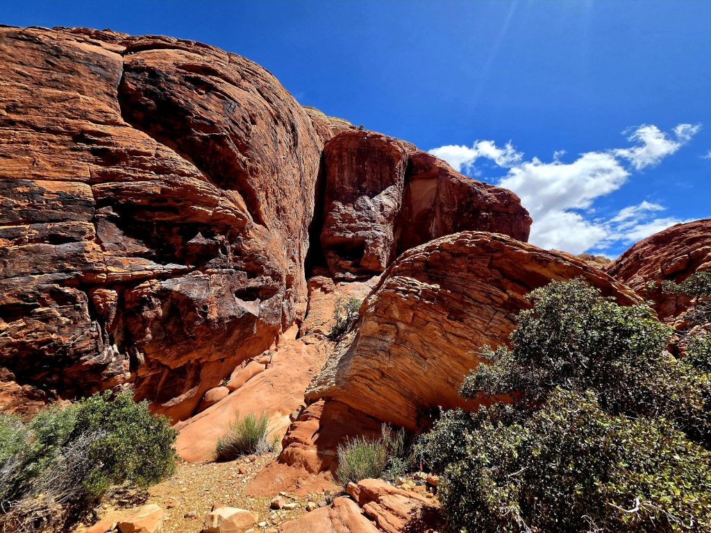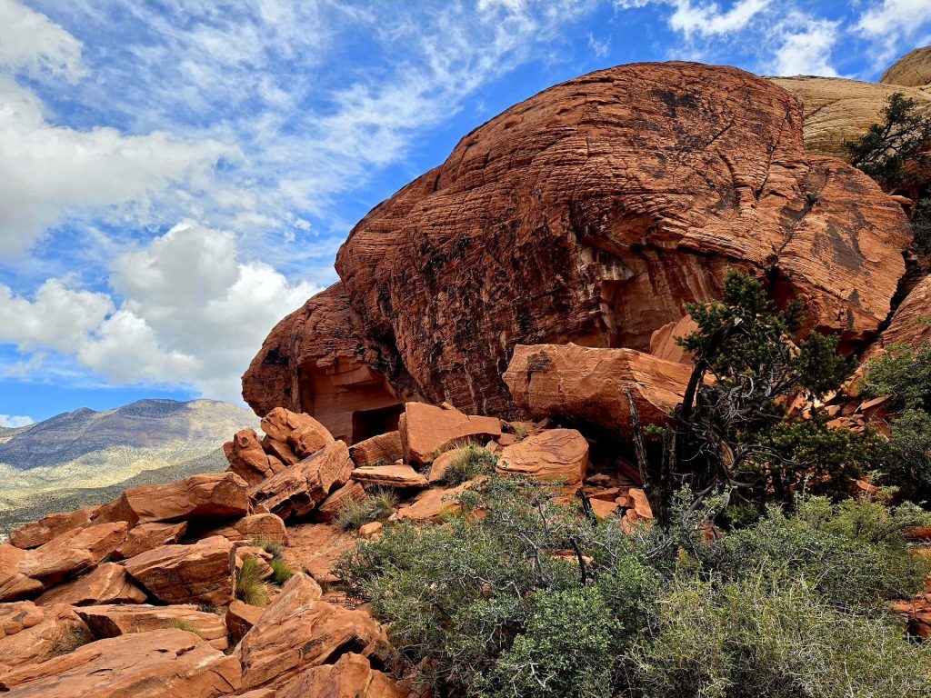And so, the next day, we did the exact opposite. We drove about 20 miles west of Las Vegas to the Red Rock Canyon National Conservation Area. This park is administered by the BLM and requires a reservation, which we did online (because we have a national parks lifetime pass it only cost us $2.00, but otherwise it would be $22.00). The visitor center for Red Rock Canyon is beautiful and well-organized. We got good hiking information and spotted a desert tortoise in its enclosed habitat outside the visitor center.
