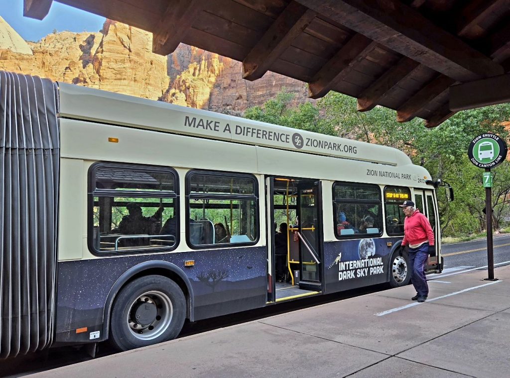 At 8:30 the next morning, we waited in our car to enter the park once again, barely found parking at the enormous parking lot at the visitor center, and then hopped on the shuttle bus to ride up through most of Zion Canyon. For much of the year, you cannot drive private cars through the canyon, so the free shuttle is one of your only options for exploring the heart of Zion National Park.