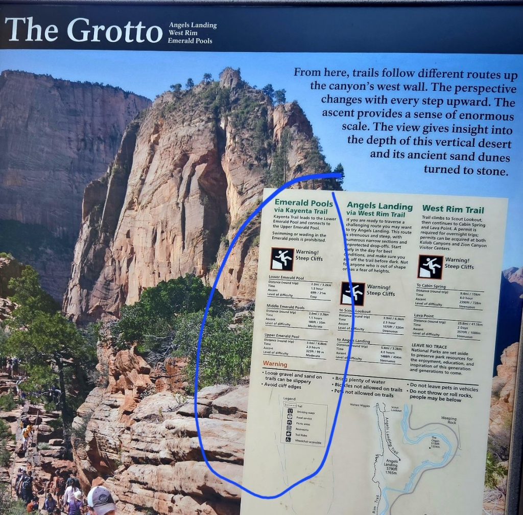 Hopping on the shuttle once again, we got off at Shuttle Stop 6 (The Grotto) and began our 3-1/2-mile hike along the Kayenta Trail, up to the Upper Emerald Pool, on to the Middle Emerald Pool, and ending at the Lodge (Shuttle Stop 5). We had perfect weather for this hike that is mostly without shade. The views were spectacular, and the misty waterfall at the Upper Emerald Pool was a refreshing sight.