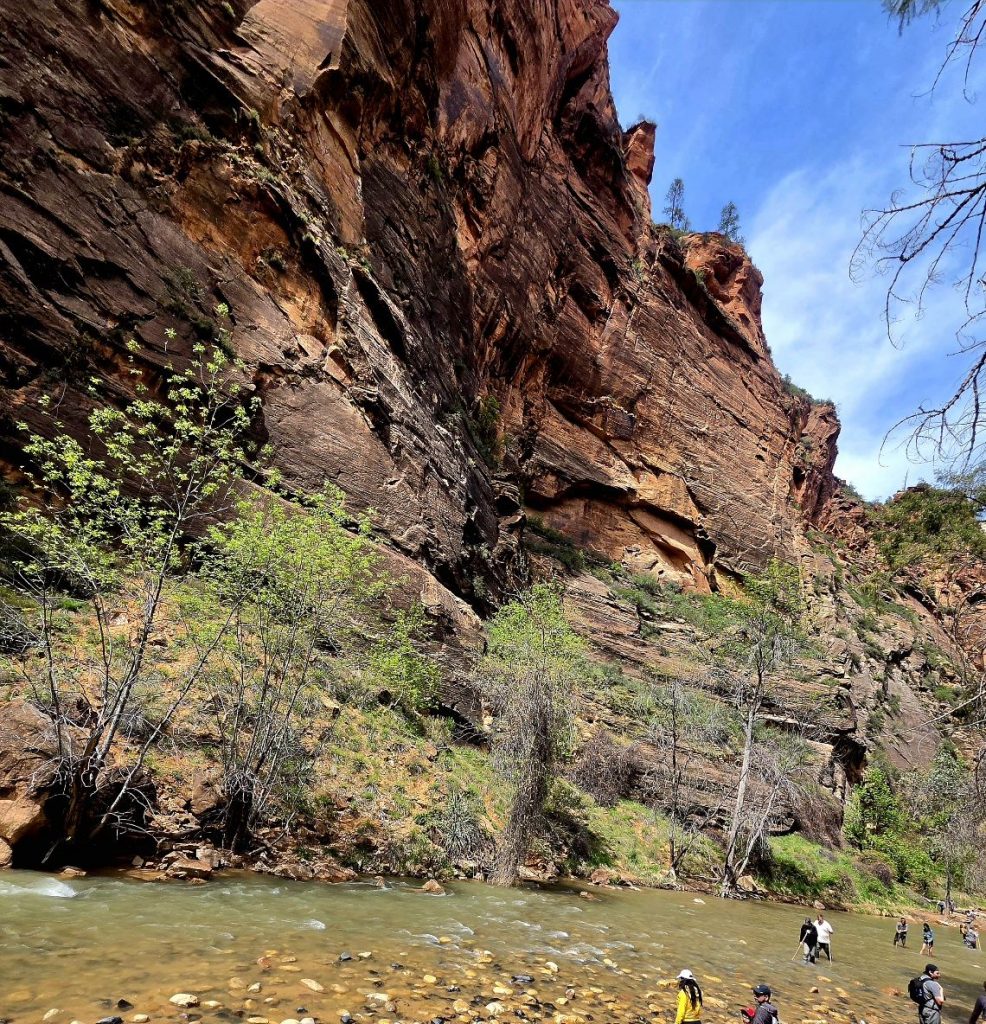 At the Temple of Sinawava, we locked up the bikes and hiked along the Riverside Walk (2.2 miles round trip), enjoying the Virgin River and lots of people! This is the place where many folks put on waders and carry big wooden sticks to hike The Narrows, where the Virgin River goes through a slot canyon and you literally have to walk in the water. Since the water temperature was 47 degrees, we opted to just enjoy the view from land, having done a short walk in the river through The Narrows when we visited 35 years ago.